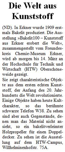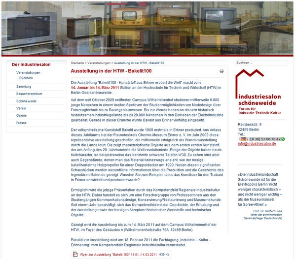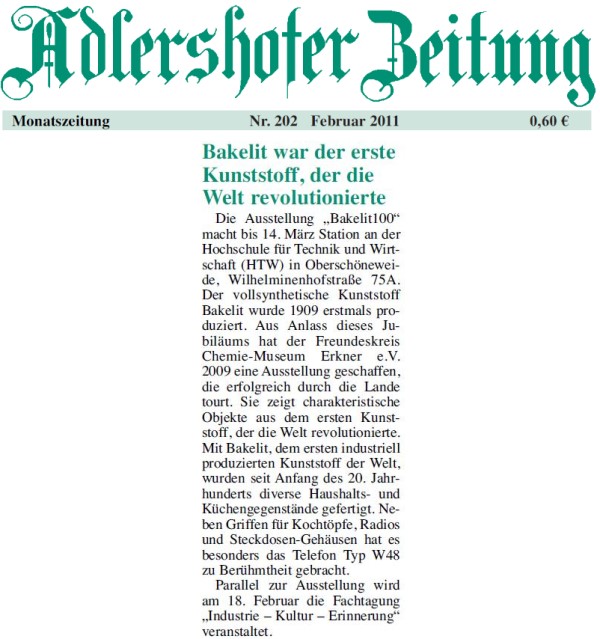 Die Ausstellung "Bakelit100 - Kunststoff aus Erkner erobert die Welt" macht vom 14. Januar bis 14. März 2011 Station an der Hochschule für Technik und Wirtschaft (HTW) in Berlin-Oberschöneweide. Auf dem seit Oktober 2009 eröffneten Campus Wilhelminenhof studieren mittlerweile 6.000 junge Menschen in einem breiten Spektrum der Studienmöglichkeiten von Modedesign über Fahrzeugtechnik bis zu Bauingenieurwesen ... [mehr]