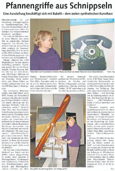 In Erkner wurde 1909 erstmals Bakelit produziert. Die Ausstellung »Bakelit100 – Kunststoff aus Erkner erobert die Welt«, zusammengestellt vom Freundeskreis Chemie-Museum Erkner ... [mehr]