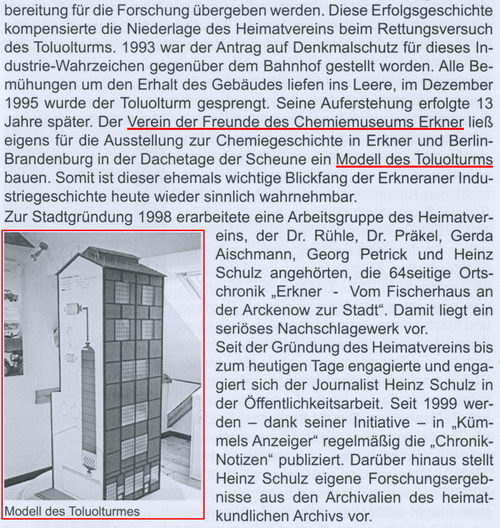 Anlässlich des 20. Gründungsjubiläums des Heimatvereins Erkner erschien zur Festveranstaltung am 28.10.2011 das 16. Erkneraner Heft. In dieser Reihe gab auch schon mehrere Beiträge zur Chemiegeschichte Erkners.