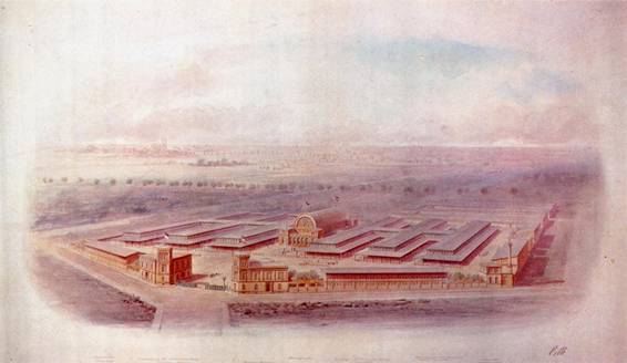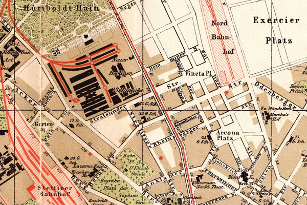 - das Gelände liegt auf bzw. gegenüber dem ca. 1870 zwischen Brunnen- und Ackerstraße eröffneten Neuen Berliner Viehmarkt (Ortsteil Gesundbrunnen, heute B-Mitte)