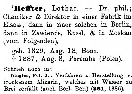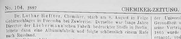 "Dr. Lothar Heffter, Chemiker, starb am 8. August in Folge Gehirnschlags in Poremba bei Zawiercie. Derselbe war lange Jahre Director der Liebermann'schen Fabrik bedruckter Stoffe in Berlin, leitete dann eine Albuminfabrik und folgte schliesslich einem Rufe nach Russland."