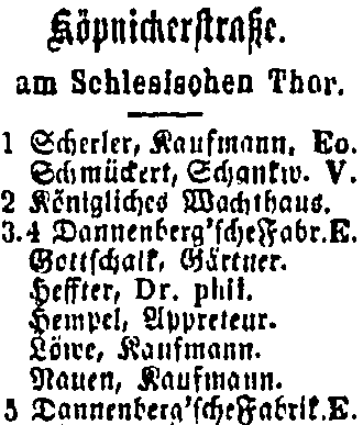 - die "Dannenberg'sche Fabrik" in der Köpnickerstr. 3-5 ist der Vorläufer der "Liebermann'schen Fabrik bedruckter Stoffe" (mit Färberei und Textildruck), als deren langjähriger Direktor Heffter später bezeichnet wird