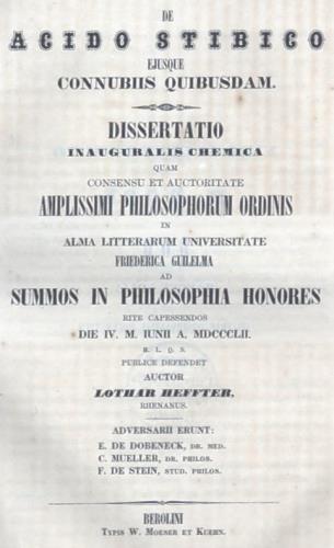 - 1852 - Dissertation: "De acido stibico ejusque connubiis quibusdam" vom 4. Juni