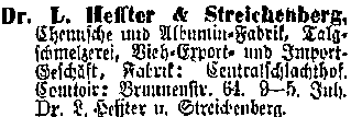 - 1873 - im ABB erscheint erstmals "Dr. Lothar E. Heffter & Streichenberg, Chemische und Albumin-Fabrik, Talgschmelzerei, Vieh-Export- und Import-Geschäft, Fabrik: Centralschlachthof. Contoir: Brunnenstrasse 64"