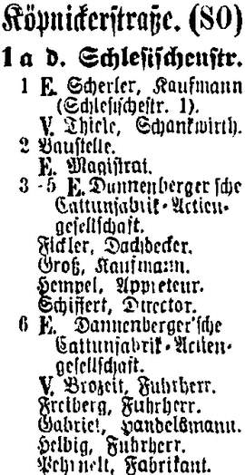 - 1867 - in der Köpnickerstr. 3-4 erscheint im ABB der Name "Dannenberger'sche Cattunfabrik", mit Liebermann als "Fabrikbesitzer" und Eigentümer