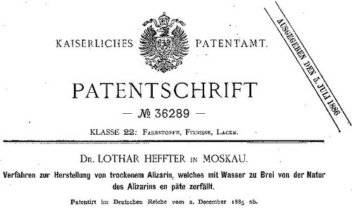- 1885 - von Moskau aus reicht H. ein "Verfahren zur Herstellung von trockenem Alizarin, welches mit Wasser zu Brei von der Natur des Alizarins en pâte zerfällt" zum Patent in Deutschland ein, das ihm am 2.12. unter der Nr. 36289 gewährt wird