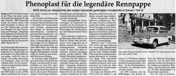 Zwei Erkneraner Abiturienten unterhalten sich über Vergangenes. Fragt der eine:“ Früher jagte auf den Straßen ein Phenoplast-Etwas umher, weißt Du, was ich meine?“ Der andere nach längerem Überlegen: „Nein, ich weiß wirklich nicht, was Du meinst.“ „Na das war die berühmte Rennpappe, der Trabi.“