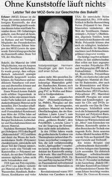 Ein letztes Beispiel sind „selbstleuchtende Kunststoffe“, die beim Anlegen einer Spannung Licht aussenden. Ein elektrisch leitfähiger selbstleuchtender Kunststoff (Baytron) kann vom 20. bis 27. November im Rathaus in der Ausstellung „Bakelit 100 – 100 Jahre Kunststoff aus Erkner“ des Freundeskreises Chemie-Museum Erkner besichtigt werden.