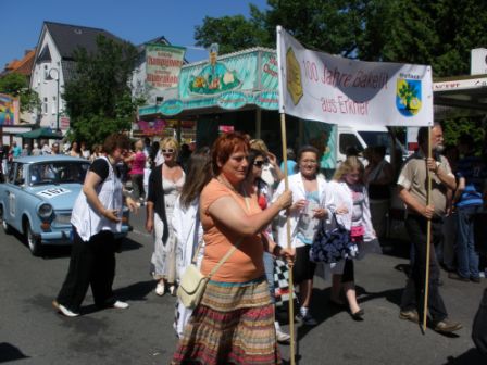 [05.06.10] Vom 4.-6. Juni fand traditionsgemäß das Erkneraner Heimatfest statt. Auch der Freundeskreis Chemie-Museum Erkner e.V. war beim Festumzug dabei. In diesem Jahr feiern wir 150 Jahre Chemiestandort Erkner und 100 Jahre Bakelite GmbH Erkner-Berlin. Unterstützt wurde der Freundeskreis durch 4 Schülerinnen des Carl-Bechstein-Gymnasiums sowie Schülern der Oberschule Erkner, die selbst angefertigte Gegenstände im Festumzug trugen, die früher aus Bakelit gefertigt wurden.