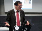 Prof. Herzog mit einer Schutzweste bei seinem Vortrag