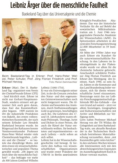 [20.02.] Auch in diesem Jahr haben wir zu unserem traditionellen Baekeland-Tag nach Erkner eingeladen. Werksführung bei der Dynea Erkner GmbH - auf historischem Bakelite-Gelände -, Schau-Pressen, eine kleine Ausstellung und interessante Vorträge zum Themea "150 Jahre BASF - 25 Jahre BASF Schwarzheide" haben wieder viele Gäste zu uns geführt. ... [mehr]